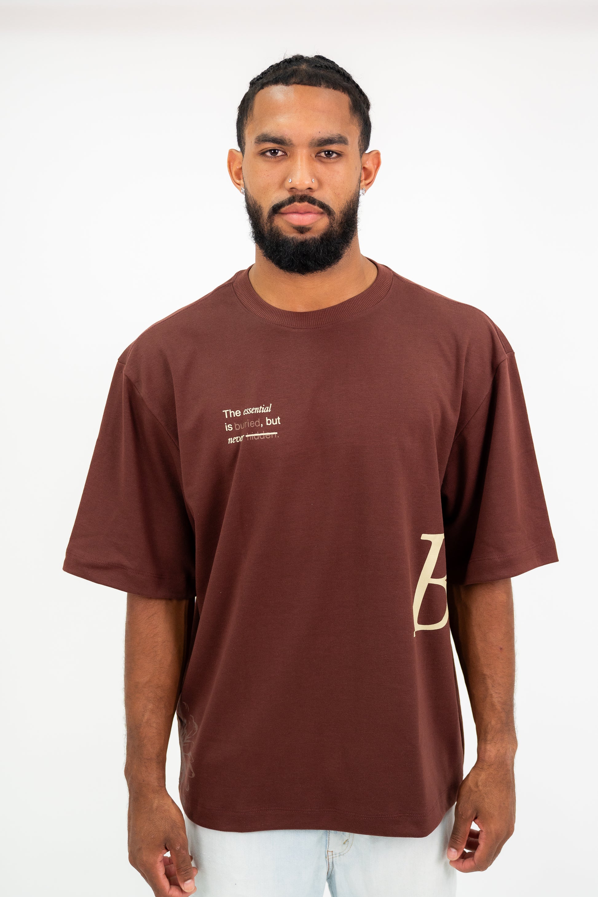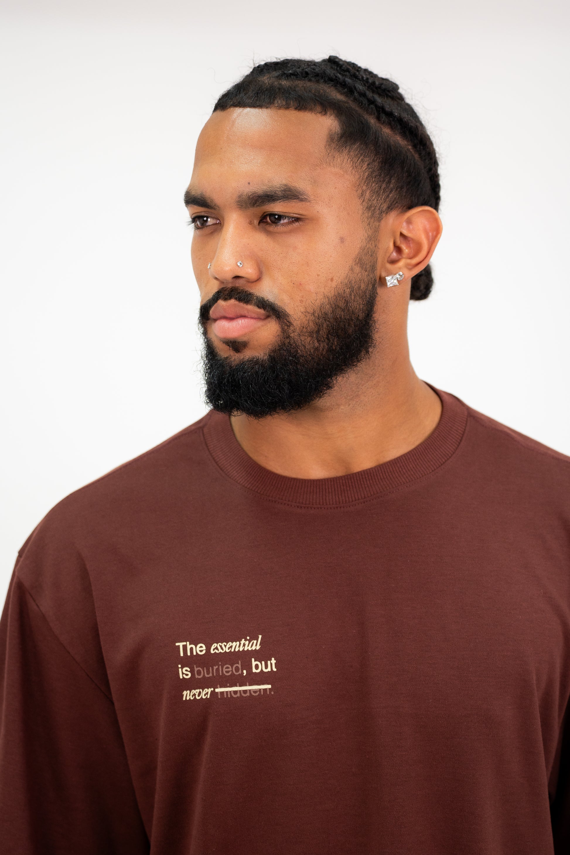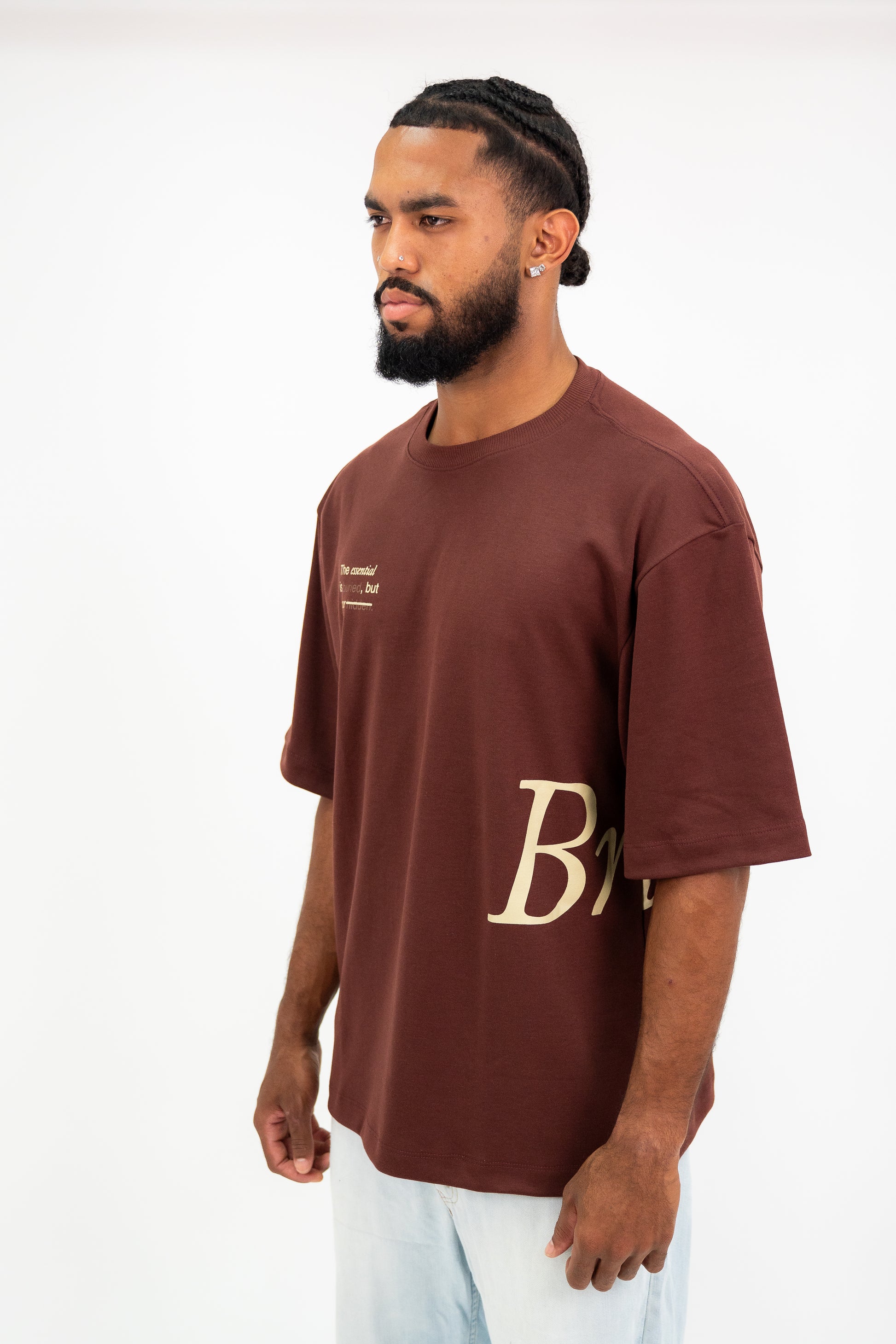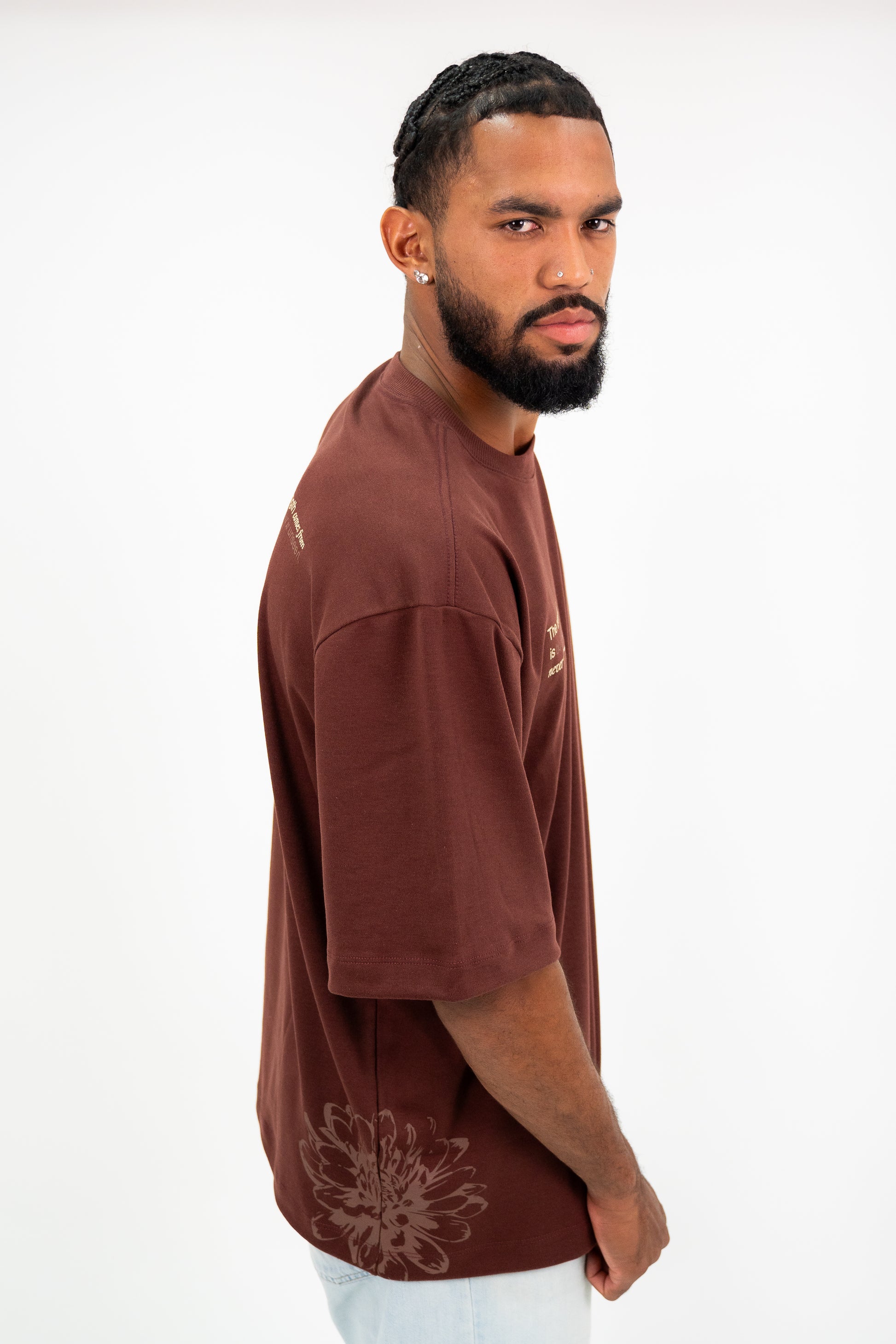 Confecionada com tecido suedine 100% algodão na cor marrom e feita com malha pesada. A peça possui 270g (alta gramatura). O design apresenta estampas em silk, simbolizando detalhes essenciais de uma peça.